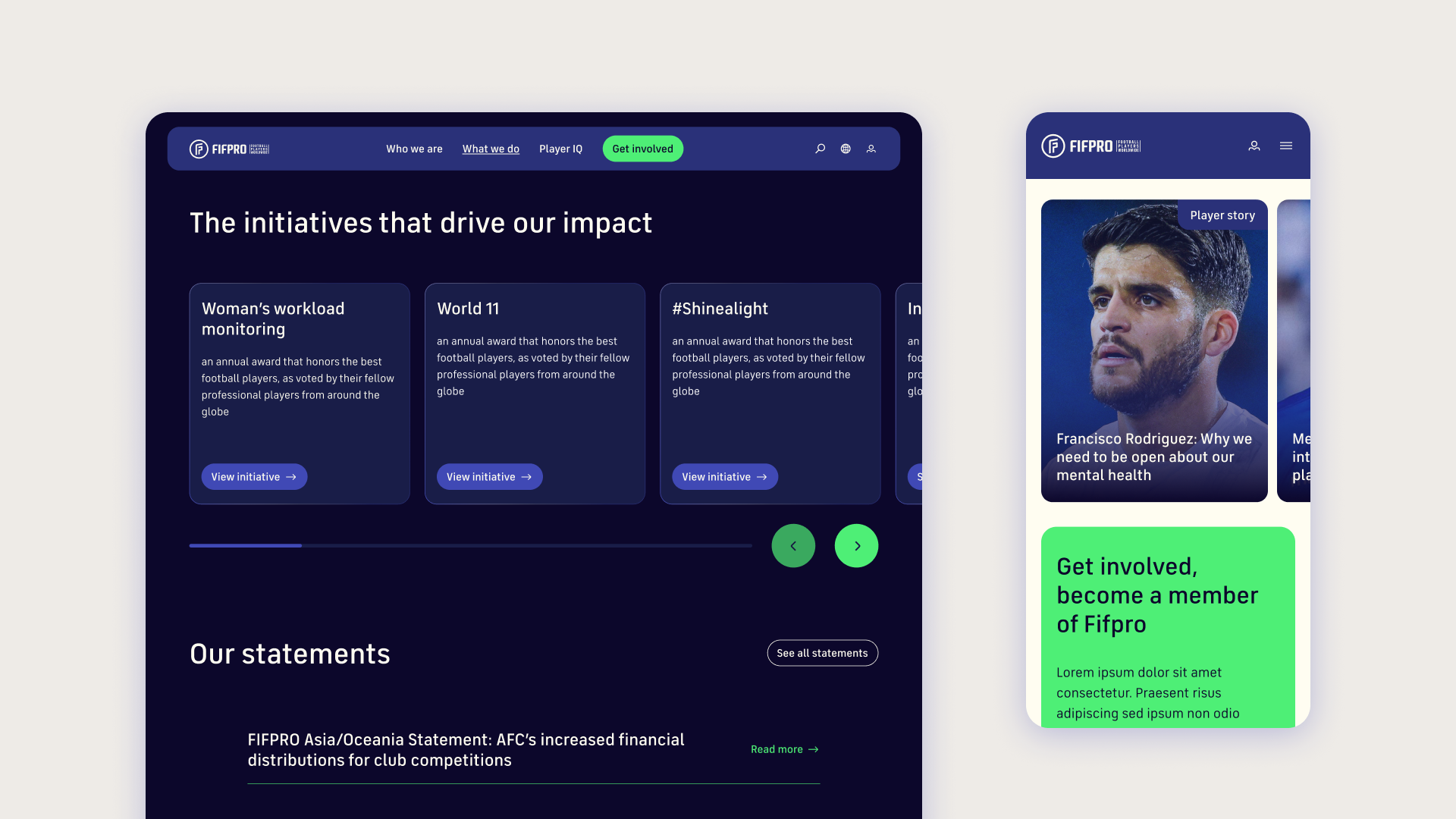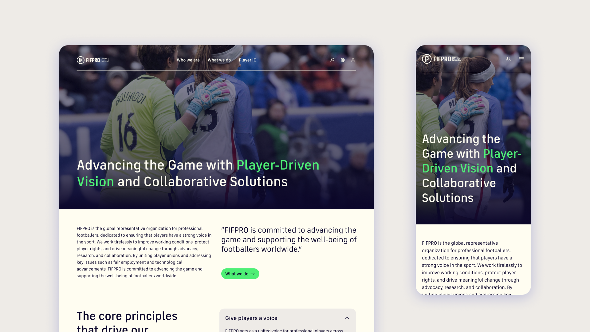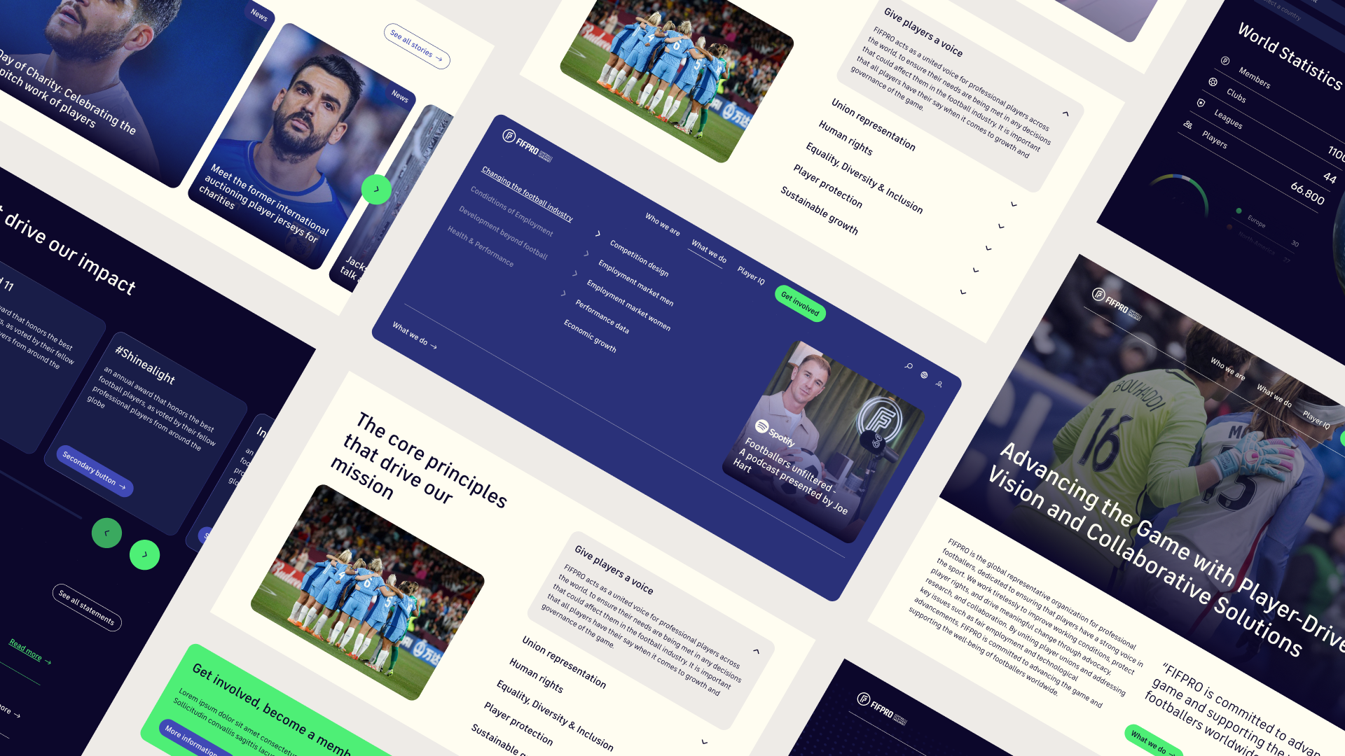 FIFPRO must show why players’ lives need improving and how that mission turns into action. This helps players see their ambitions reflected in the union and motivates others to align with its vision. The site is structured around three simple principles: