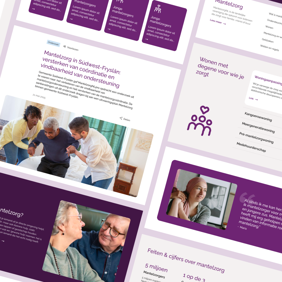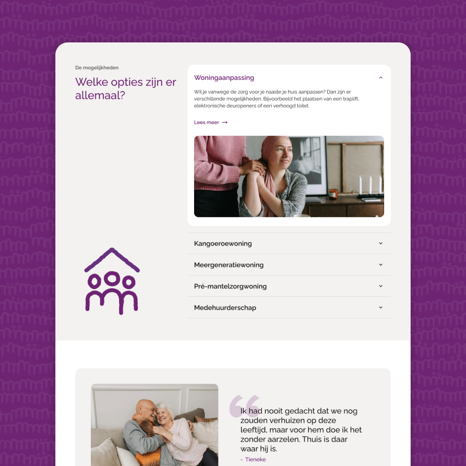 Based on these insights, the website was redesigned with a refreshed visual identity, new navigation and a structure built around caregivers’ real questions. The navigation includes dedicated sections for caregivers, professionals and other stakeholders, while themes such as laws and regulations, finances and combining care with work help visitors quickly find the support relevant to their situation.