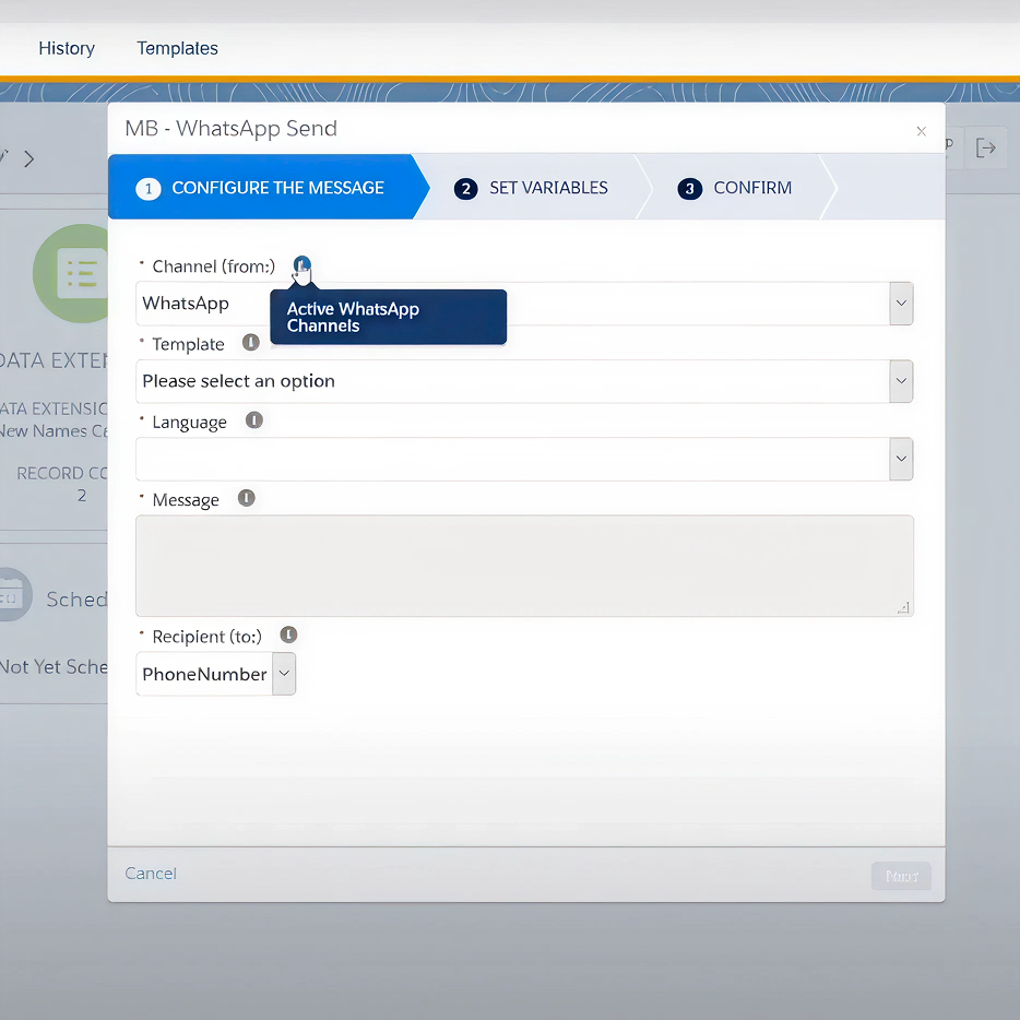 We built a managed AppExchange app that brings MessageBird’s channels into Journey Builder as native activities. Marketers can drop a WhatsApp, SMS, LINE, or Viber step into a flow, define who receives it and when, and tailor content using the same data as email. A lightweight configuration UI manages credentials and channel settings, and templates cover common cases such as order updates, appointment reminders, and service alerts.